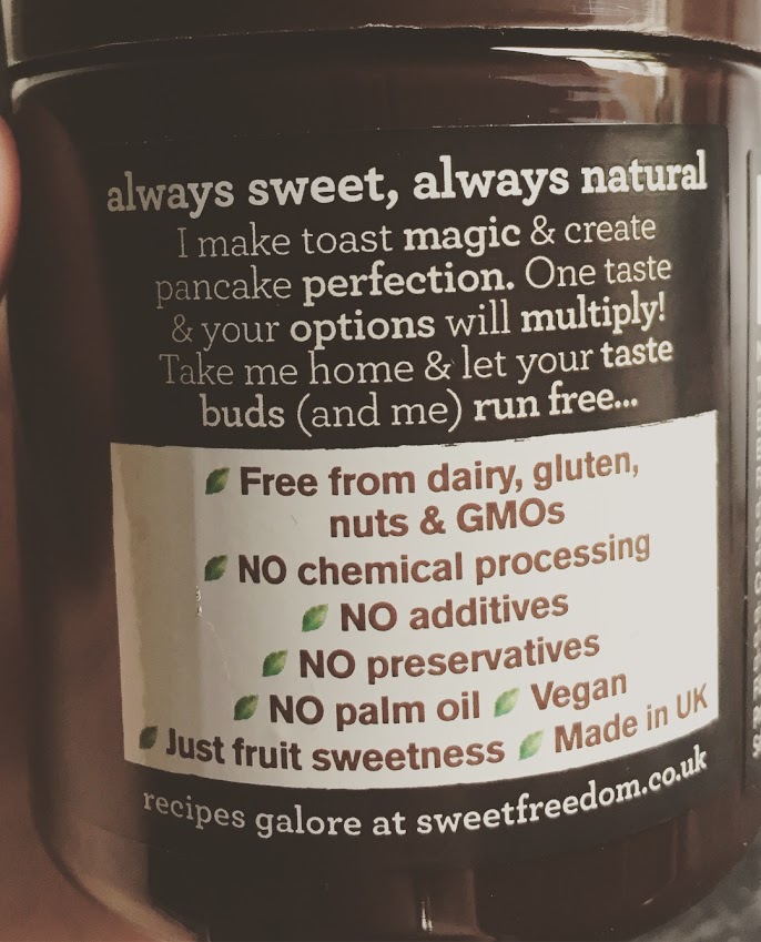 This is quite a recent addition to my list, as I only tried it a couple of weeks ago following a trip to Tesco. Having been nut free for a while, I’d given up on chocolate spread assuming that as I could no longer have Nutella, there was no point in ever having chocolate spread as they would never live up to the memories! However, I saw this little pot on the shelf and was attracted by all of the winning slogans… “vegan” “free from dairy, gluten, nuts & GMOs” “no chemical processing” “no additives” “no preservatives” “no palm oil”.