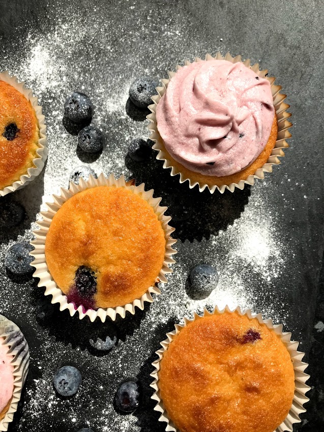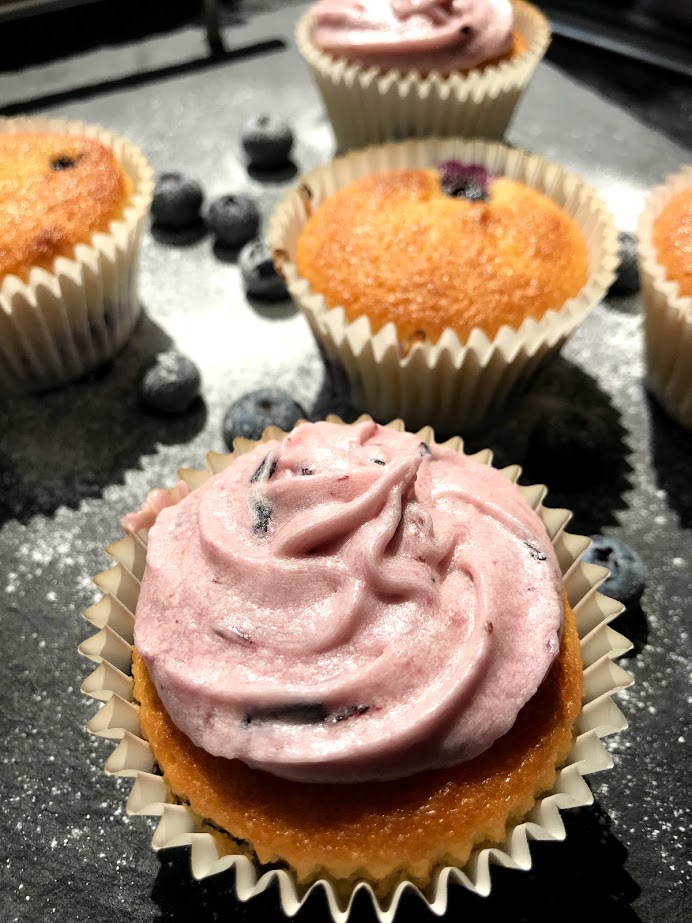 Preheat the oven to 180 degrees/gas mark 4. Cream the butter and sugar together in a mixing bowl. Add the eggs and the flour gradually, folding as you go. Once you have an even cake mix, add the blueberries and stir carefully.Prepare 12 cupcake cases in a tin. Gradually add the mixture until you have filled the cases three quarters of the way up (depending on how big you like your cupcakes) place these in the oven for 15-20 minutes, or until golden brown.